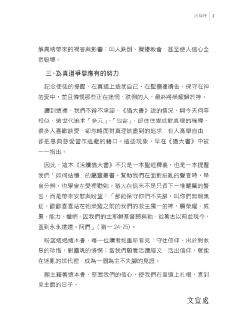 本書《活讀猶大書》,正是一次對這卷短小卻極其尖銳之經卷的深度釋讀。全書以猶大書二十五節經文為骨幹,逐節講解、層層展開,竟發展成一部約一百五十餘頁的專書,充分顯出:這不是一卷「內容貧乏」的短書,而是一篇極其濃縮、卻極其重要的屬靈戰書。