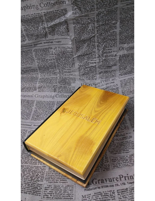 封面、封底皆採用當地橄欖木雕刻[5餅2魚]及[JERUSALEM]圖示