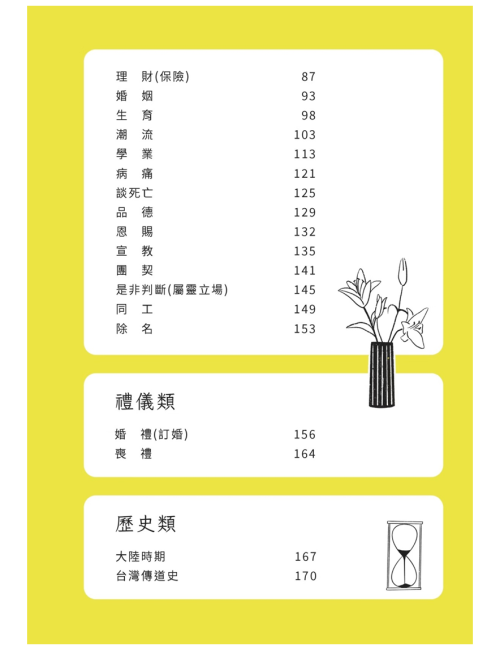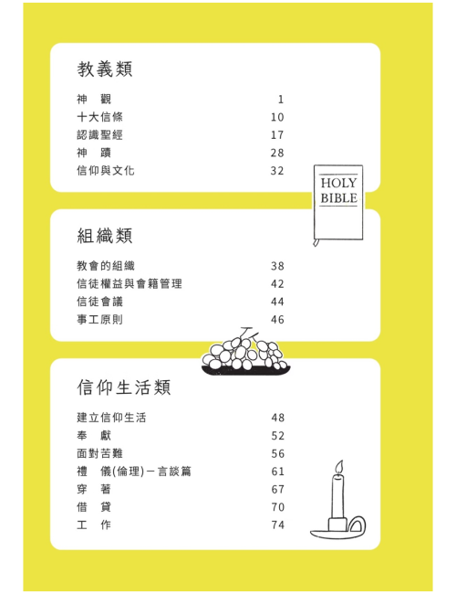 廣泛的主題覆蓋:從聖經的「神觀」到「婚禮與喪禮」,本書涵蓋了基督徒生活的各方面。不論是正在探索信仰、深化信仰還是在日常生活中實踐信仰,都能在這裡找到指引。