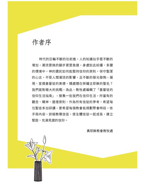 時代的巨輪不斷的往前進,人的知識似乎是不斷的增加,潮流更換的腳步更是急速,身處如此紛擾、多變的環境中,神的選民如何能堅持信仰的原則,保守聖潔的心志,不受人間潮流的影響,且不斷的發光發熱,展現、宣揚基督徒的美德,隨處隨在榮耀主耶穌的聖名?我們面對極大的挑戰,為此,教牧處編輯了「基督徒的信仰生活指南」,搜集一些我們在信仰生活,所當有的觀念、精神、道理原則,作為所有信徒的參考,希望每位聖徒多加研讀,更希望每個教會能規劃聚會時段,依手冊內容,詳細教導信徒,使全體信徒一起成長,建立堅固、充滿見證的信仰。