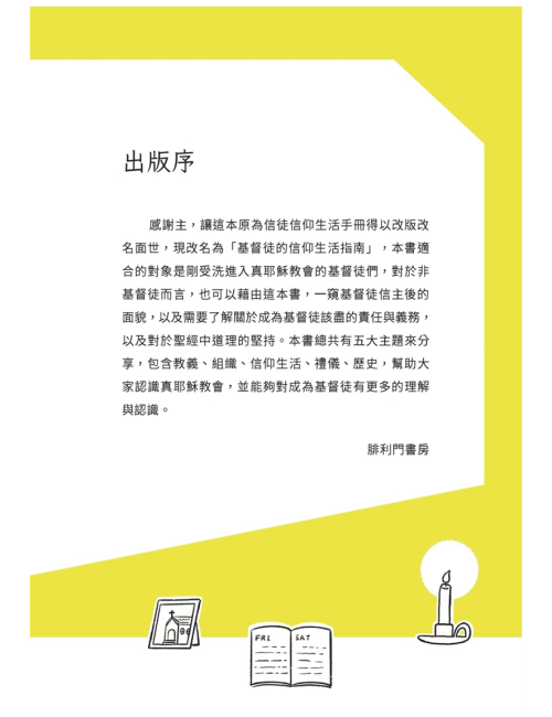 感謝主,讓這本原為《信徒信仰生活手冊》得以改版改名面世,現改名為《基督徒的信仰生活指南》,本書適合的對象是剛受洗進入真耶穌教會的基督徒們,對於非基督徒而言,也可以藉由這本書,一窺基督徒信主後的面貌,以及需要了解關於成為基督徒該盡的責任與義務,以及對於聖經中道理的堅持。