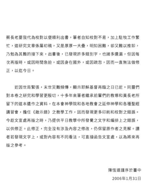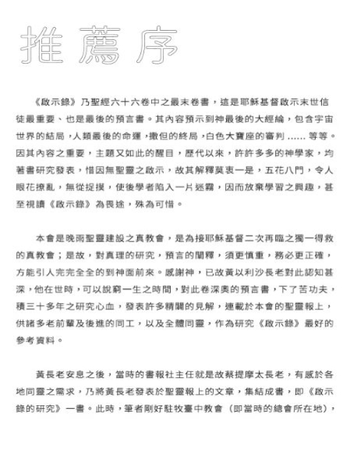 《啟示錄的研究》是一部深入剖析《啟示錄》的重要著作,由黃以利沙長老歷經多年心血研究而成。作為聖經最後一卷,《啟示錄》預示了基督再臨和末世將要發生的重大事件,對信徒的信仰與靈命成長有深遠影響。本書以詳盡的章節安排,從緒言、總論到本論,逐步解開《啟示錄》的奧秘,特別注重其中的靈意闡釋,提供了許多獨到而精闢的見解。