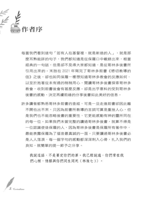 作者不僅對經文逐段解析,還透過真實的見證與生活反思,幫助讀者在閱讀過程中體會到保羅的牧者之心。書中探討了哥林多後書中的許多主題,包括「患難中的安慰」「基督的香氣」「分別為聖」「樂捐行善」等,這些主題既引導信徒在信仰上扎根,也教導在面對挑戰時保持信心與愛心。