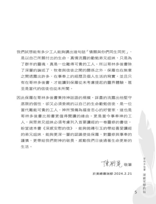 如同哥林多後書二章 4 節所述:我先前心裡難過痛苦,多多的流淚,寫信給你們,不是叫你們憂愁,乃是叫你們知道我格外的疼愛你們。從這段敘述中便可看出保羅對於哥林多教會深刻的愛。我們也期盼這本書喚起每位讀者的心,一起感受保羅那即使在苦難中仍能保持希望的不屈精神。他的經歷提醒我們,即便在逆境中,以及教會內部各種紛爭中,我們依然能夠找到安慰和力量,這份力量源於對神堅定不移的信仰和對未來的積極期待。