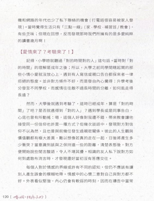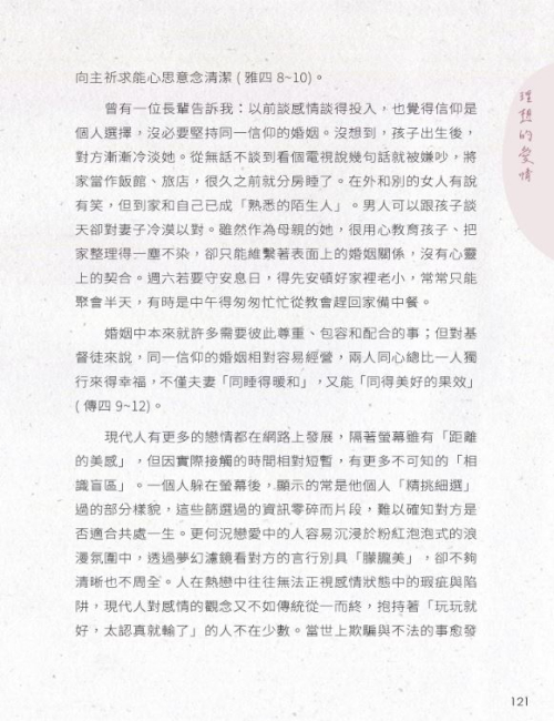 此次再版《婚姻,相疼正好》,筆者將初版內文部分予以修潤,續寫婚後生活中與另一半的溝通與教養孩子認識真神與遵守道理的體會。誠摯希望藉由書寫婚前對象選擇,與在主內養育下一代——真神所賜產業 (詩一二七3),漫長生命中的信仰體悟,能提醒自身持守這份信仰,也與眾人分享在此「恩典之路」的感動。從升學、職涯與婚姻等「人生大事」的選擇,到婚後夫妻相處,並作為兩名女兒的母親,同時也是陪伴國中生成長的班導師,兼在職進修碩士生等多重身分時期的忙碌生活中,切實感受到這一路上雖然充滿挑戰,但主的恩典卻一如「繁花盛開」,愈是艱難時刻愈顯豐盛、馨香。