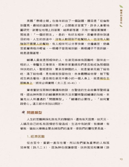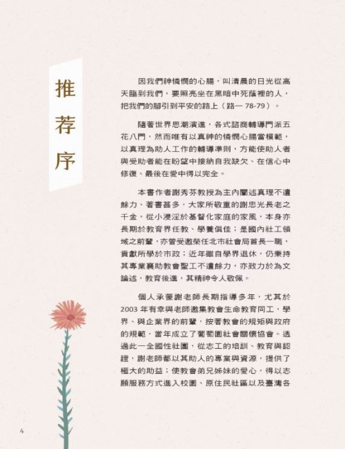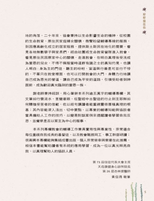 又每個人的隱私權是受重視的,決不在未得到當事人的同意而洩漏其祕密。保密是每位輔導人員當遵守的原則之一。筆者曾生了一場大病後,決定要為神工作,將聖經中有關輔導的知識和技能加以整理,於是在神的帶領下,及個人的努力,完成了十二篇的一系列輔導知識和原則,分別於《聖靈月刊》中每月一篇,以一年時間刊載完成。如今在經過八年之後,想將這十二篇文章,再做修訂集成單書,修訂完成後約五萬多字,得到文宣處李恩冠執事及編輯淑華和文怡姐妹的支持和協助,盼望此書的出版,能提供主內有志於輔導信徒的傳道、宗教教育的老師,及北區教區所成立的全國性「基督教葡萄園社會關懷協會」的電話輔導專線「微聲盼望」的志工們能有所參考,而造福更多的需要協助的同靈們。