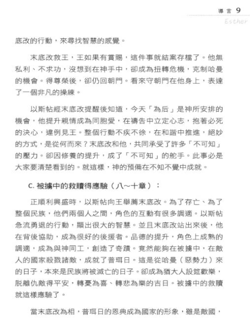 這本書不僅提供了《以斯帖記》的背景和解釋,還強調了信徒如何在生活中應用這些原則。它提醒我們,即使在看似無望的境地中,神的救贖計劃仍然有效,我們每一個人都可以在神的安排中找到自己的位置。 透過閱讀這本書,讀者將能夠理解《以斯帖記》的故事和教訓,並從中獲得面對挑戰的靈感和指引。