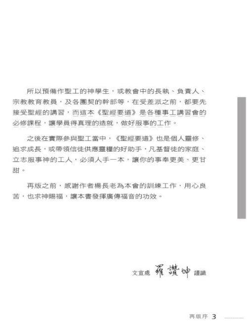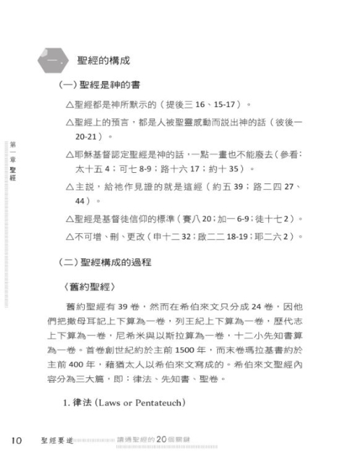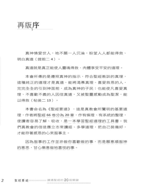 本書共二十章,雖未達到盡善盡美之境地,但卻均屬不可或缺之真理;所以不單限於教會神學教材,或查經會課本,信徒亦應各持一本,進而贈送親朋戚友,實為研求真道之理想南針,勿作等閒看,則幸甚矣。本書於1960 年出版2000 本,於不久之間即被購一罄;本想依據各章大綱寫成文章,然後再版,然因時間不許,迄今仍無法著手。 茲因各方的急需,不得已仍依初版內容倉卒付梓,對於經文章節之遺漏,或解釋未臻完滿,在所難免,敬希讀者原諒,並多賜指教,常為代禱。