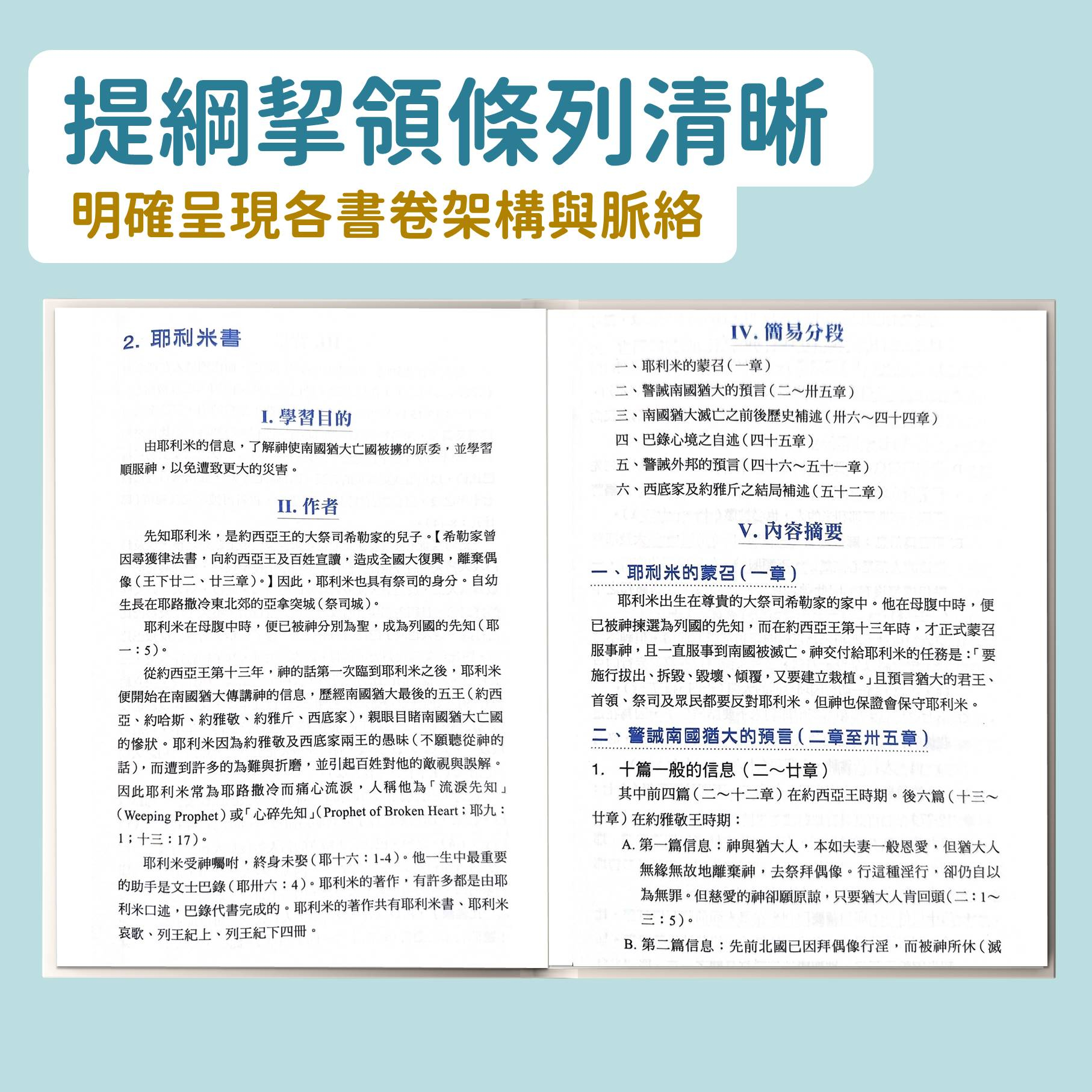提綱挈領條列清晰:逐章解析學習目的、作者簡介、背景說明、簡易分段、內容摘要、書卷特色、中心思想等,明確呈現各書卷架構與脈絡。